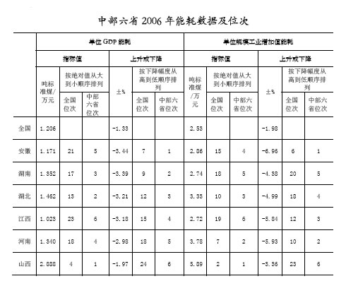 2006年是“十一五”开局之年,在湖南省委、省政府的领导下,全省上下认真贯彻落实科学发展观,狠抓节能降耗工作,全省单位GDP能耗下降3.39%,降幅比全国平均水平高2.06个百分点,列全国第九位,居中部六省第二位(仅次于安徽,见附表),节能降耗初见成效,经济发展呈现出“又好又快”的发展趋势。