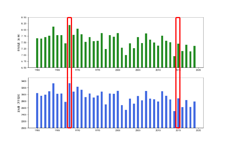 图2 将1980年-2020年的测风数据,以年份作为时间轴,将风速数据带入风机功率曲线,计算该风机的逐年发电量情况