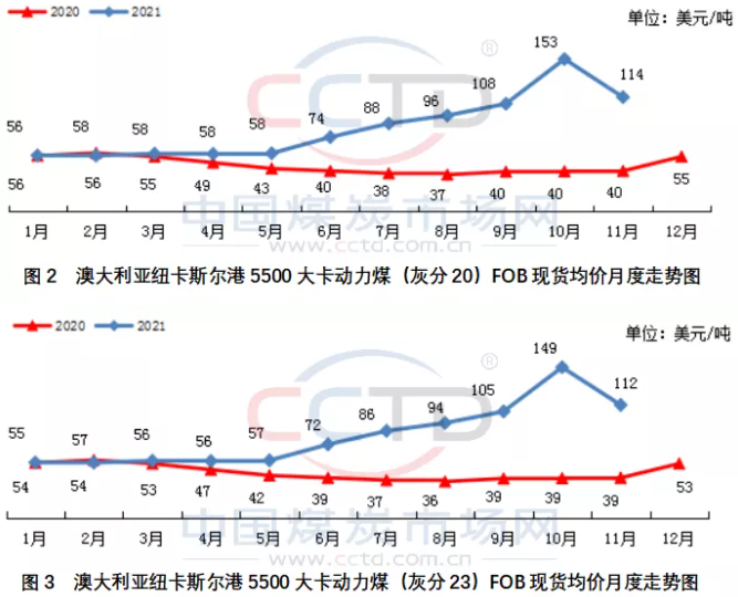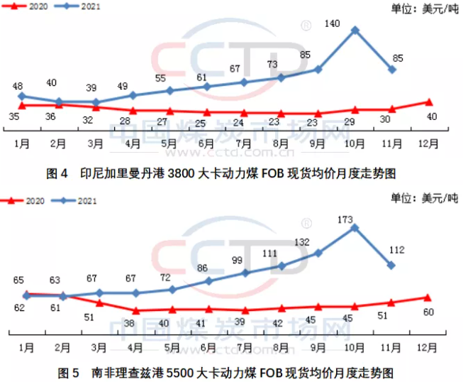 11月份,国际动力煤市场各主要煤炭出口国离岸价格均结束了持续数月上涨的势头,开始高位回落。澳洲煤、印尼煤和南非煤离岸价月环比纷纷下降,分别下降约25%、39%和35%。