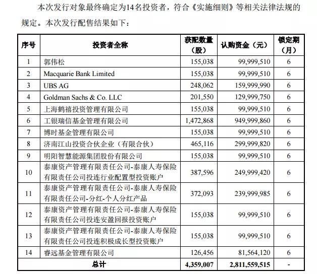 12月14日,迈为股份披露定增情况报告书,确定此次发行价格为645元/股,发行数量约为435.9万股,募资总额约为28.12亿元;发行对象最终确定为14家,其中明阳智能获配近1亿元。