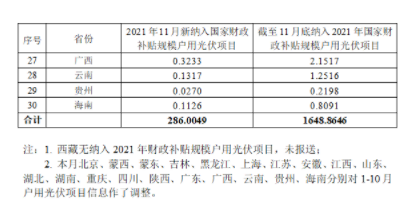 根据各省级能源主管部门、电网企业报送信息,经国家可再生能源信息管理中心梳理统计,2021年11月新纳入国家财政补贴规模户用光伏项目总装机容量为286万千瓦。截至2021年11月底,全国累计纳入2021年国家财政补贴规模户用光伏项目装机容量为1648.86万千瓦。详细情况见附表。