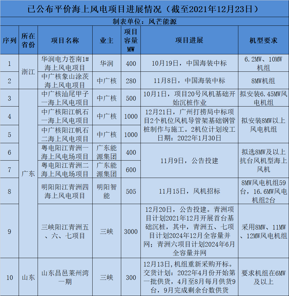 据风芒能源统计,根据公开新闻,目前已有12个共计7.985GW海上风电平价项目正式启动。其中,有2个项目已完成机组中标公示;2个项目发布机组采购公告;5个项目已宣布要投建;3个项目开始施工。