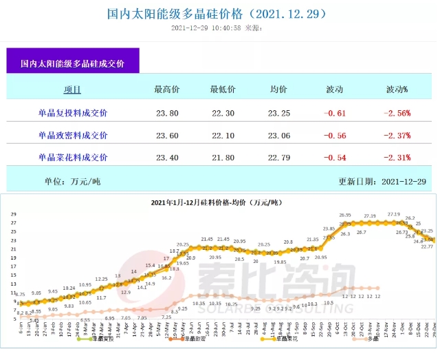 12月29日,中国有色金属工业协会硅业分会发布国内太阳能级多晶硅最新价格。其中: