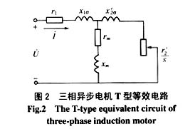 三相异步电动机可用T型电路进行等效,如图2所示,电机的功率因数角Φ为相电压与相电流的相位差,它等于电机一相阻抗Z的阻抗角。当电机参数已知时,阻抗Z可根据图2由式(1)计算: