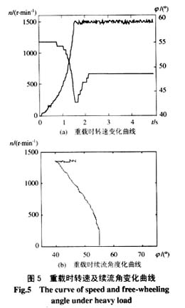 在电机端口加正弦电压时,根据理论分析,可得图3所示的转速与功率因数角关系曲线。由于晶闸管调压电路的工作原理所限,电机在软起动过程中获得的输入电压是一种斩波形式的电压,电机的功率因数角难以用实验的方法直接获得,即使得到基波的功率因数角,其实际应用价值也不大。根据晶闸管调压电路的工作原理,真正影响晶闸管输出电压的因素是电机的续流作用,而电机续流角的变化规律决定于其功率因数角,且该续流角便于实际测量,可称之为“可测功率因数角”。图4、图5分别为实际电机在轻载和重载条件下,在软起动过程中形成的电机转速及电机续流角的变化曲线,所选电机为:额定功率3kW,额定转速1440r/min。观察两组实测曲线可以看到,随着电机转速的上升,电机的续流角逐渐减小,当转速达到额定值时,续流角接近最小值,由于实际电机的转速由额定值向同步转速提升的余量很小,再加上测量原因,在续流角的回升阶段,电机转速的变化体现得不明显。对比两种情况下续流角的变化曲线可以发现,电机轻载稳定运行时的续流角较大,重载时较小。这是由于两种情况下的电机转速、激磁电流以及漏阻抗的不同造成的。实际电机续流角随转速的变化规律与图3所示曲线的规律是一致的,本文下面提到功率因数角时,均指续流角。