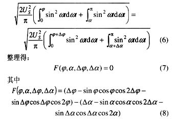 由于Φ角是随转速自动改变的,因此α角的调整必须及时跟随ΔΦ的大小,找到相应的调整量Δα,否则输出电压将偏离预期值。当电机转速发生变化时,保持晶闸管输出电压UL相对稳定是很重要的,因为只有做到这一点,才能在此基础上,通过调整触发角α,使UL按预期的规律改变。在保持UL恒定的前提下,α跟随ΔΦ的调整量Δα,可根据式(4)及式(5)获得: