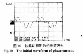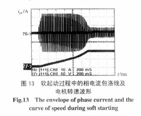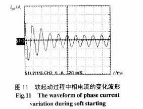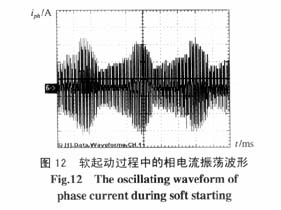 实验条件与图45相同。图10所示为电机软起动初期,当晶闸管触发角较大时的电机电流波形。由于系统无中线,晶闸管工作时必须至少有两相同时导通才可构成回路,假设图中为A相的电流,则它是由A-B相及C-A相晶闸管导通形成的,因而电流形成了双峰形状。图11为电机软起动结束前电机电流的变化情况。图12为电机软起动过程中,在没有功率因数角反馈的情况下,出现的电机电流振荡波形。图13为具有功率因数角闭环控制的情况下,软起动过程中电机电流的变化过程及电机转速的变化情况,可以看到,在电机起动初期,电流较大,电机转速在逐渐上升,当转速达到额定值时,电流达到最小值,在整个起动过程中,电流和转速的变化都很平稳,没有出现振荡现象,电机软起动时的起动电流是其稳定运行电流的2~3倍,而电机直接起动时的起动电流是其稳定运行电流的5-7倍。