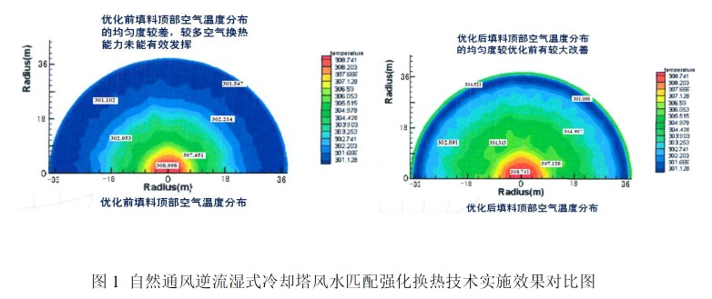 在采用冷却塔全三维CFD高网格建模计算技术弄清塔内进风各参数场分布的前提下,重新设计布水系统,使其与进风相匹配,再根据布水情况重新设计调整填料的布置厚度,使其适应蒸发换热的要求。具体实施效果见图1。