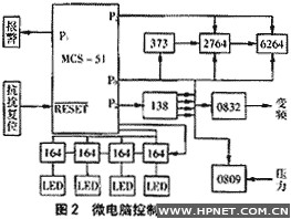 其中,0809(为A/D转换)用以采样水泵出口压力;0832(为D/A转换)用于控制变频器以调整水泵转速,串口定为方式0,扩展为用来实现4位数码管显示;2764及6264为扩展的程序存储器及数据存储器,2764存放程序及智能压力设定的有关表格。