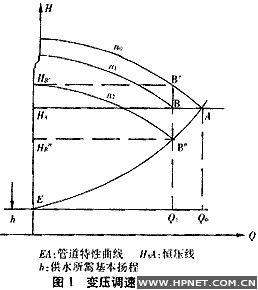 由图1可见,当流量从Q0减为Q1时,如采用恒速泵则扬程升至HB′,此时B′B″段的扬程是多余的;如采用恒压变频调速泵则其转速将由原来的n0下降为n1以维持恒压HA(对应的扬程为B点),此时BB″段的扬程是多余的,但B′B″>BB″,显见恒压调速比恒速供水节能。